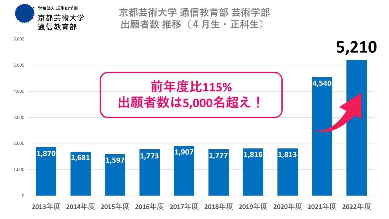 学校法人瓜生山学園 京都芸術大学(京都市左京区/学長 吉川左紀子)通信教育部 芸術学部の2022年度春入学の出願者数が確定し、総出願者が5,210名(前年度 4,540名、115%)となりました。1998年度に日本で初めての4年制の通信制芸術大学を開設以来、過去最多の出願者数です。