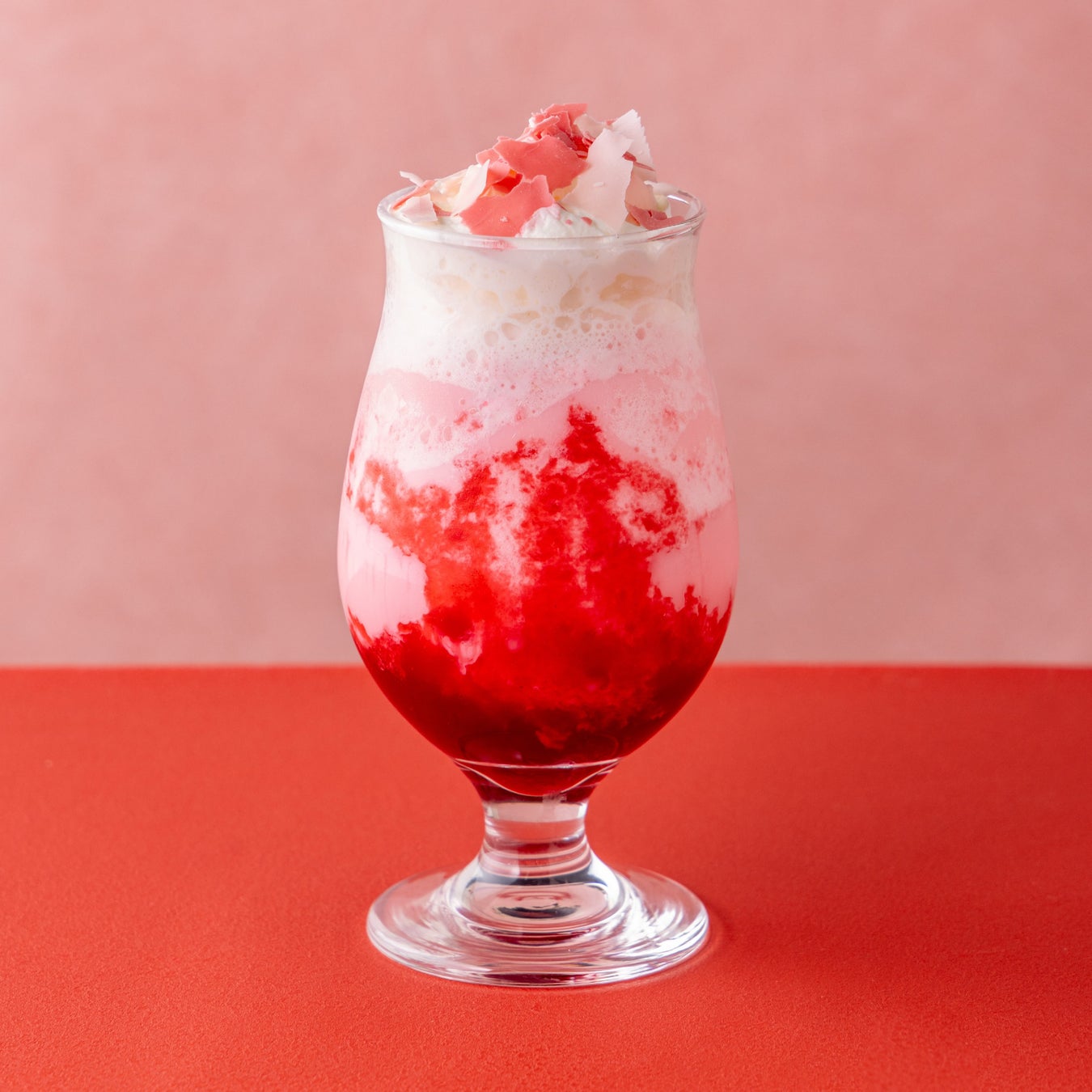 ベリーやライチ、カカオパルプを使った甘酸っぱい味わいのフローズンに、バラ風味のぷるぷる食感が楽しいジュレソースを合わせ、ホイップと花びらを彷彿とさせるチョコレートをトッピング。優しい甘さと甘酸っぱさがクセになる一品。