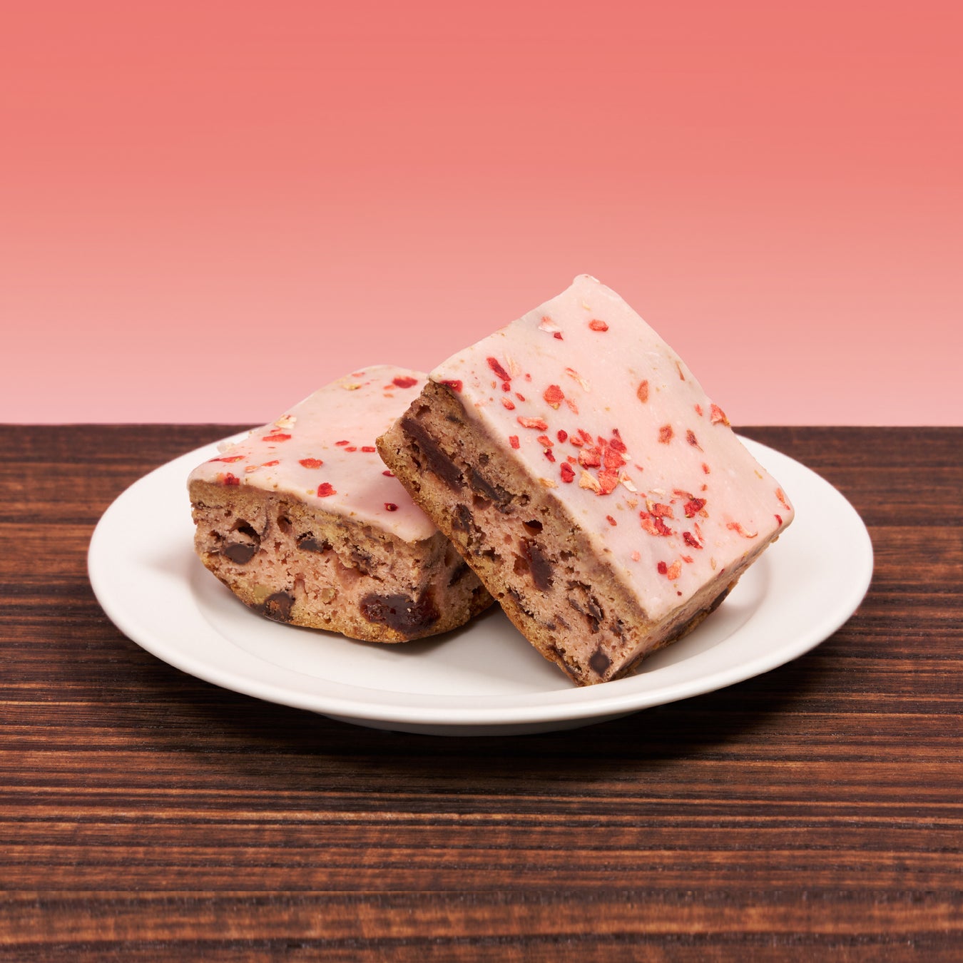 ドライベリーと胡桃がゴロゴロ入った食べ応えのあるブラウニーに、いちごチョコをたっぷりとあとがけし、甘酸っぱいドライいちごのトッピングがアクセントに。
