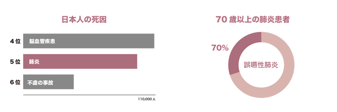 日本人の死因第5位は「肺炎」で、70歳以上の肺炎患者の7割以上は誤嚥性肺炎となっています。誤嚥性肺炎の原因の多くは、口腔嚥下機能の低下であると言われています。誤嚥性肺炎の予防においては、嚥下機能の予防が必要だと考え、嚥下機能低下を可視化し嚥下機能低下予備軍への対応策を創出することを目標に研究を進めてまいりました。
