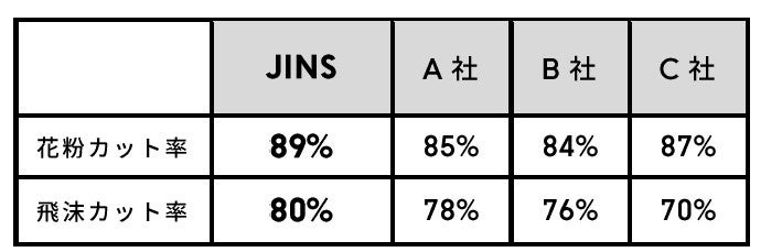 また、JINSでは2名の専門医師監修による厳密な実証実験により花粉・飛沫のカット率を計測し、他社の花粉対策メガネと比較して最も高いカット率※を実現。価格もJINS PROTECT BASIC、KIDS、JUNIORは、従来の5,500円からより多くのお客様がお求めやすいよう3,300円へと変更しています。
