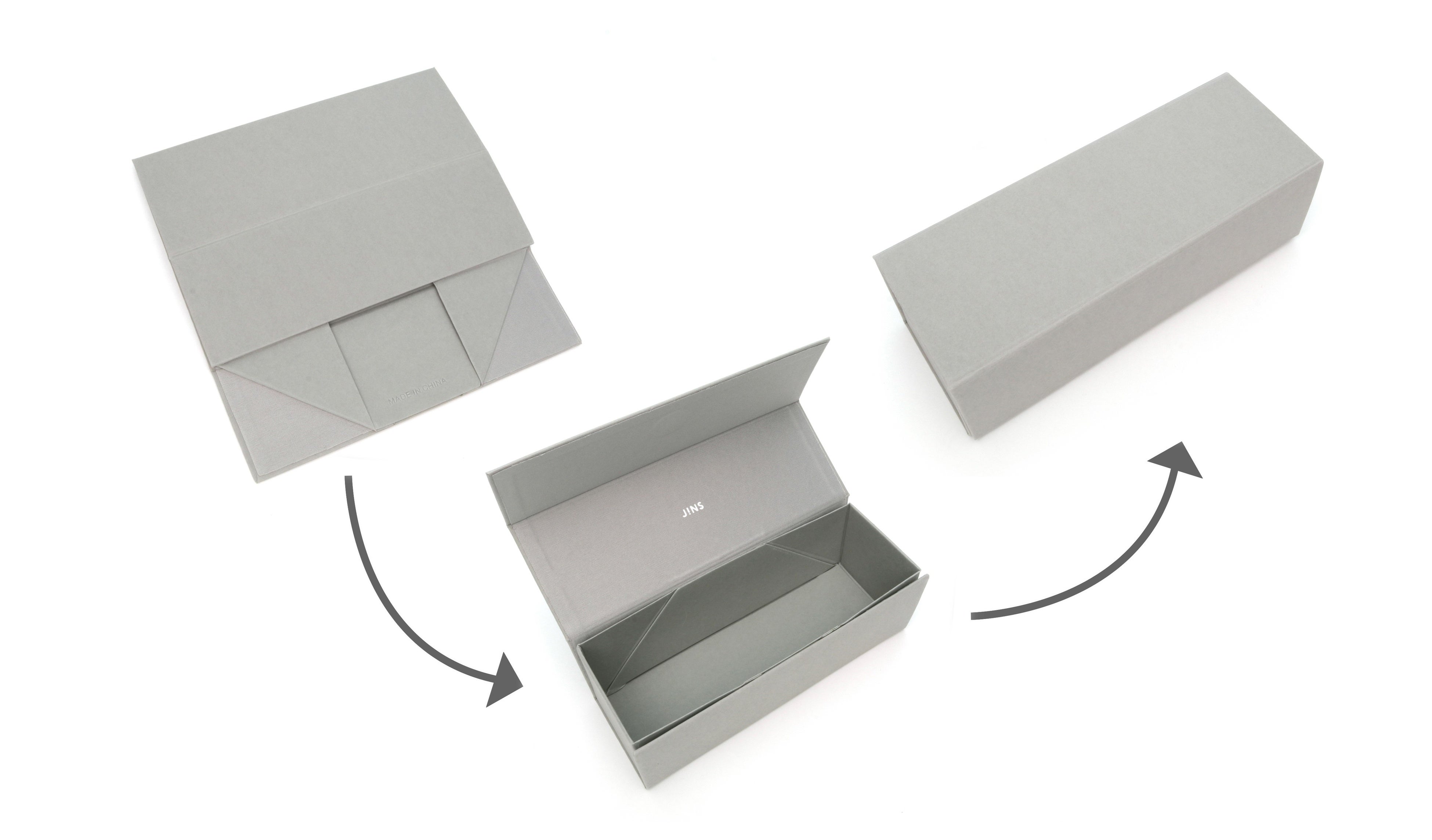 これまではメガネ本体と巾着状のソフトケースの2点がパッケージに入っているだけでしたが、新しいJINS PROTECTは、商品が入った紙製の箱がそのままメガネケースとして使えます。十分な耐久性があるよう設計された紙製メガネケースは、使用しないときはコンパクトに折り畳むこともできます。無駄の少ないサステナブルかつ便利な仕様へと進化しました。これまで通り、巾着状のソフトケースも同梱しています。
