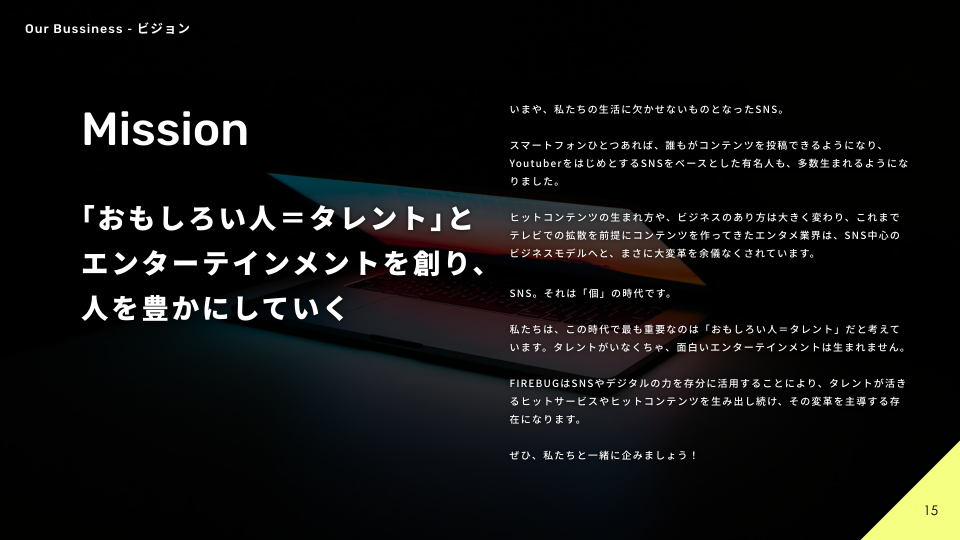 この度の新体制発表、ミッション・ビジョン刷新に伴い、改めて私たちFIREBUGの軌跡やエンタメ業界の変遷、今後についてを詳しくまとめた「カルチャーデック」を作成しました。