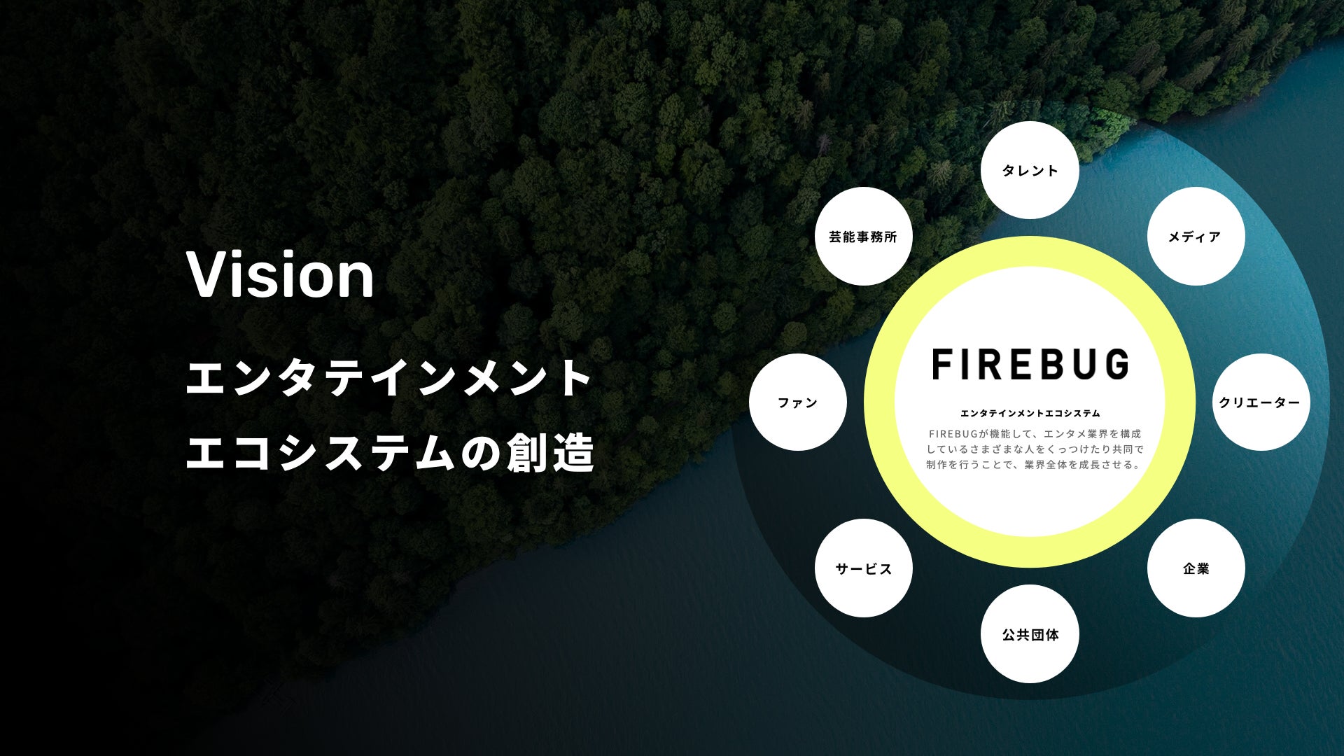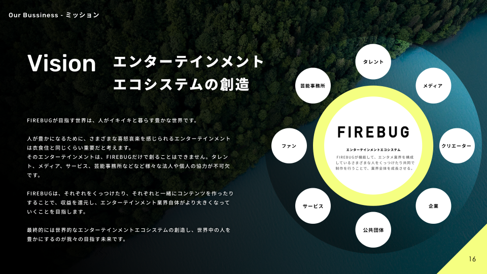 そのエンターテインメントは、FIREBUGだけで創ることはできません。法人個人に関わらず様々な人々が一緒にエンターテインメントを生み出せるエコシステムを創り、業界がより大きくなっていくことを目指します。そして、「エンターテインメントで世界中の人を豊かにすること」が、私たちの描く未来です。