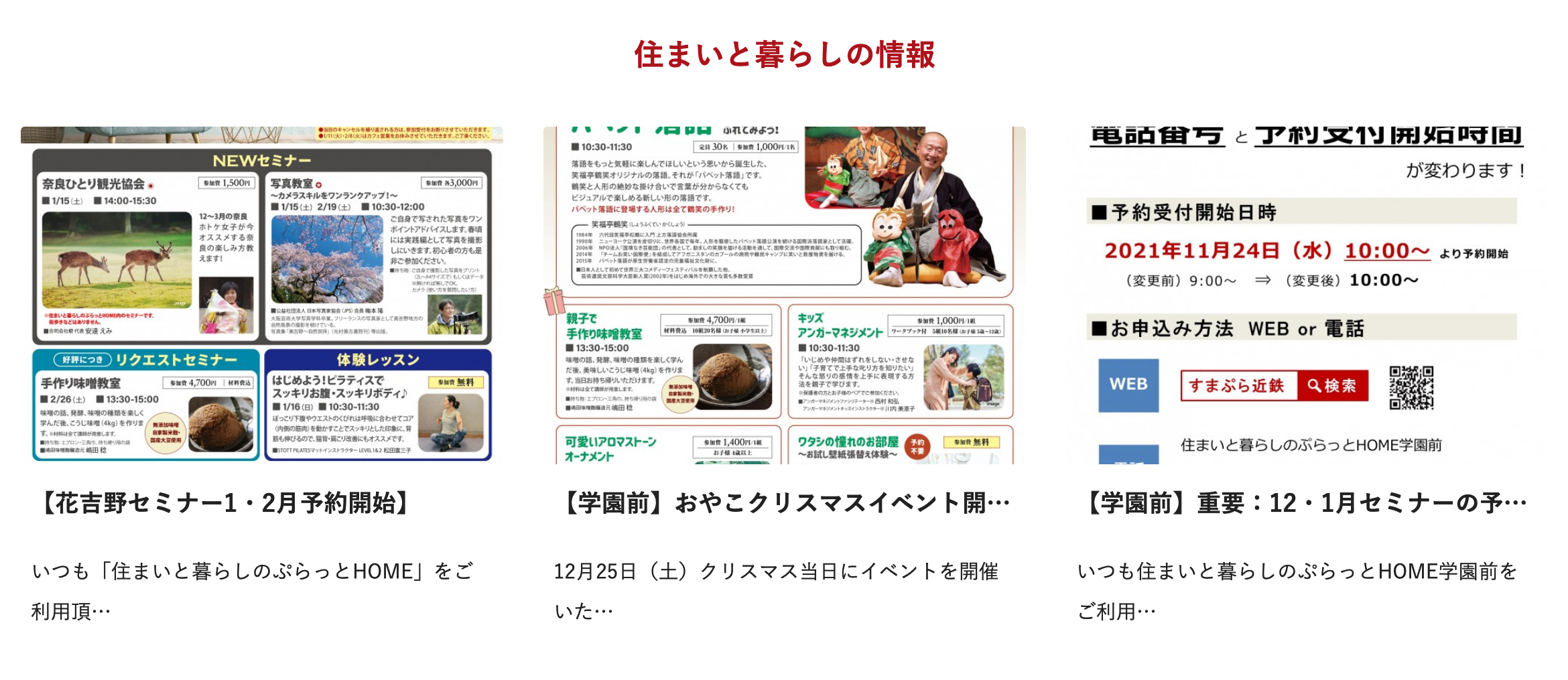 定期的に配信される住まいと暮らしの情報により、ご自宅の近くで開催されるイベントや習い事などに参加することで、情報だけではなく、地域の方同志の繋がりを提供することができるサービスです。