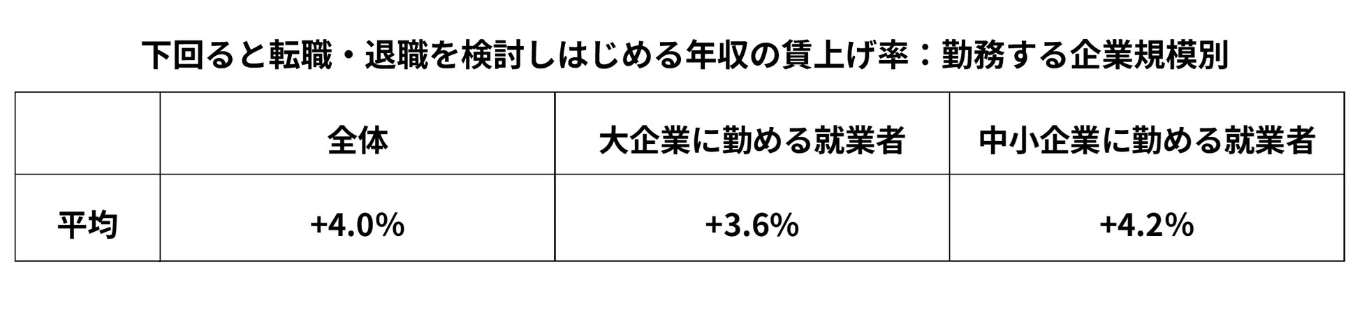 不満を感じはじめる賃上げ率と同様に、大企業の就業者よりも中小企業の就業者のほうが、転職・退職を検討しはじめる賃上げ率が高いことが明らかになりました。