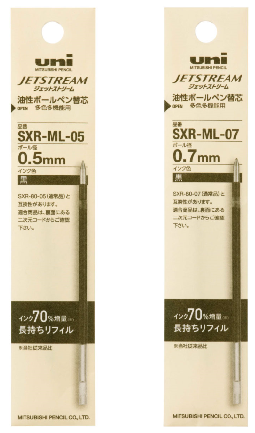 同黒インク約70%増量の「長持ちリフィル」は、リフィルのチューブを薄くすることにより当社通常品(SXR-80)と同じ形状で互換性を保ったままインク量をアップし、通常品比で約70%の増量に成功しております。チューブが薄くなることで、プラスチック使用量も通常品に比べ約30%減量、加えてパッケージには、三菱鉛筆として初めて紙製パッケージを使用し、環境へ配慮した商品となっています。