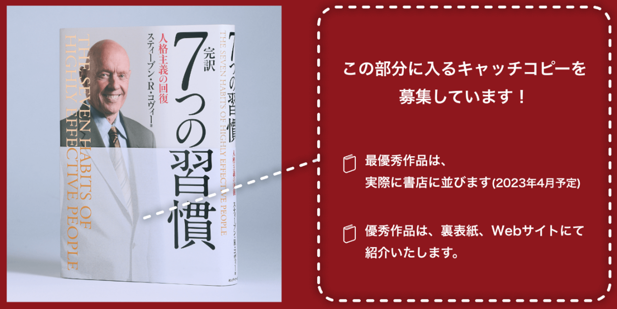 そこで、「7つの習慣」キャッチコピー大賞を実施します。次の世代に伝えるために、帯コピーを書いてみませんか。あなたの言葉が書籍の帯になります。