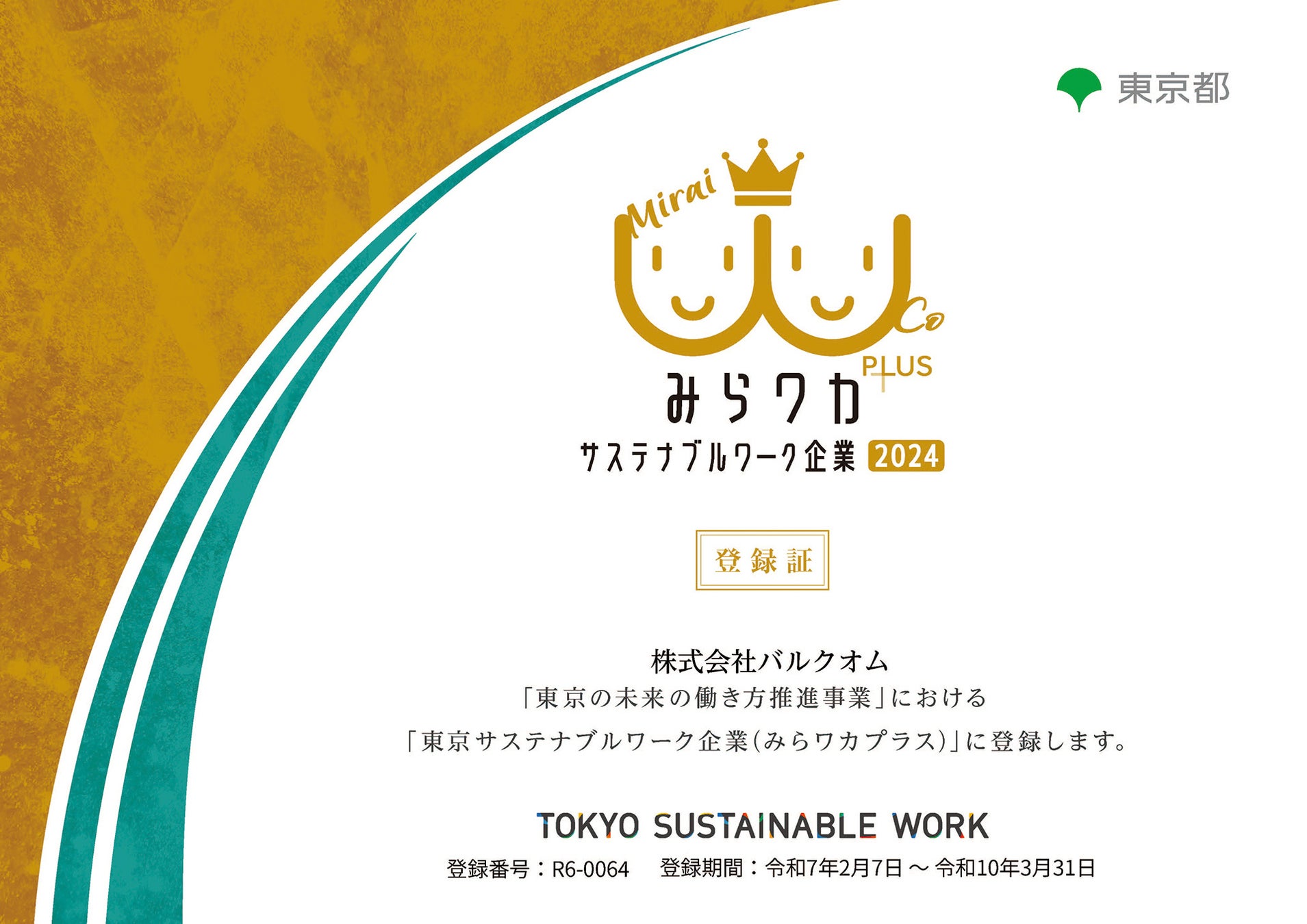 株式会社バルクオムは、東京の未来の働き方推進事業における「東京サステナブルワーク企業(みらワカPLUS)」に登録されました