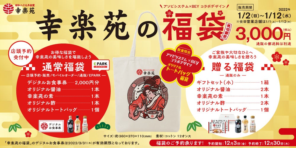 2022年のおめでたい幕開けをお祝いするお得な「幸楽苑の福袋」です。今年は通常の福袋に加え、通販サイトにて「贈る福袋」もご用意しております。「アソビシステム株式会社様とイラストレーターBEY様のコラボデザインによる浮世絵をイメージした和風かつモダンなオリジナルトートバッグの福袋です。」