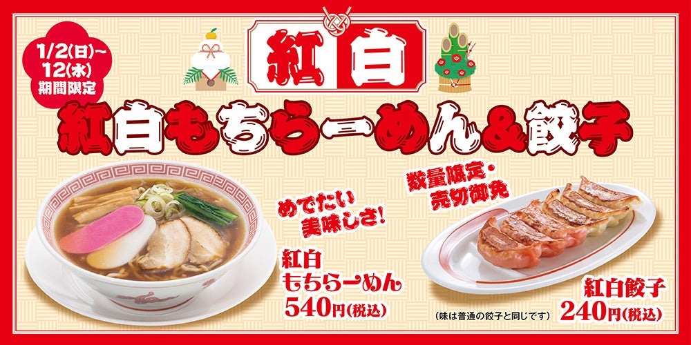 新年を祝うメニューとして、縁起のよい紅白のおもちをトッピングしたらーめんと紅白カラーの餃子をご用意しました。