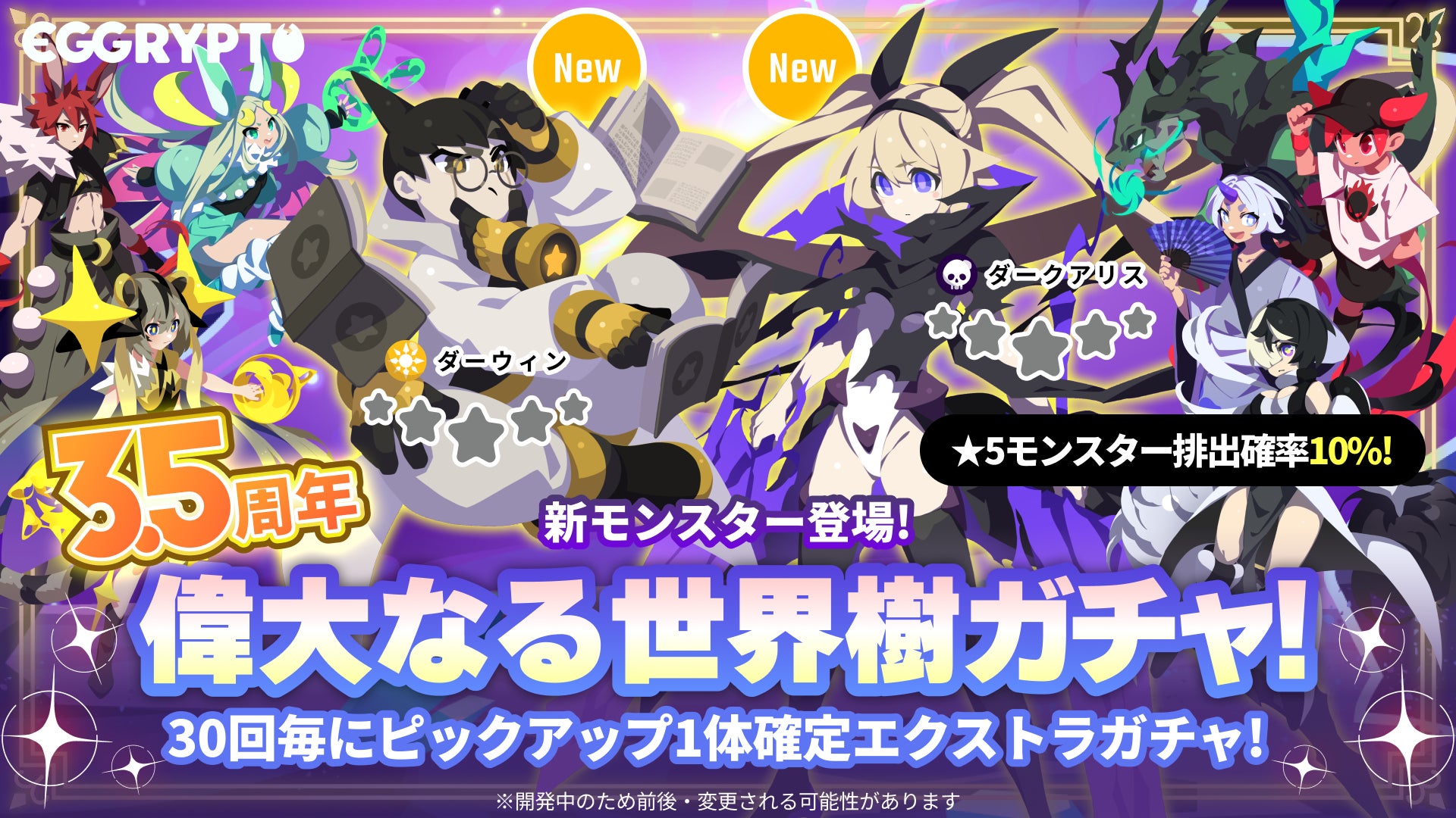 イベント開始と同時に開催する偉大なる世界樹ガチャでは、3.5周年を記念した強力なモンスター「ダークアリス」と「ダーウィン」がピックアップされます。また、30連回すごとにピックアップモンスターが1体確定で排出されるエクストラガチャを引くことができます。詳しくはゲーム内のお知らせをご確認ください。