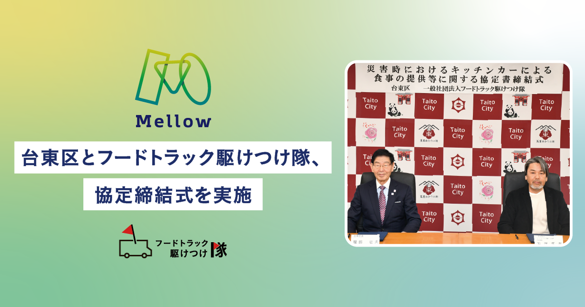 日本最大級のモビリティビジネス・プラットフォーム「SHOP STOP(ショップストップ)」を展開する株式会社Mellow(本社:東京都港区、代表:石澤 正芳、以下メロウ)が運営する「一般社団法人フードトラック駆けつけ隊」は、台東区と12月20日に行われた締結式において、災害時の防災協定を締結いたしました。
