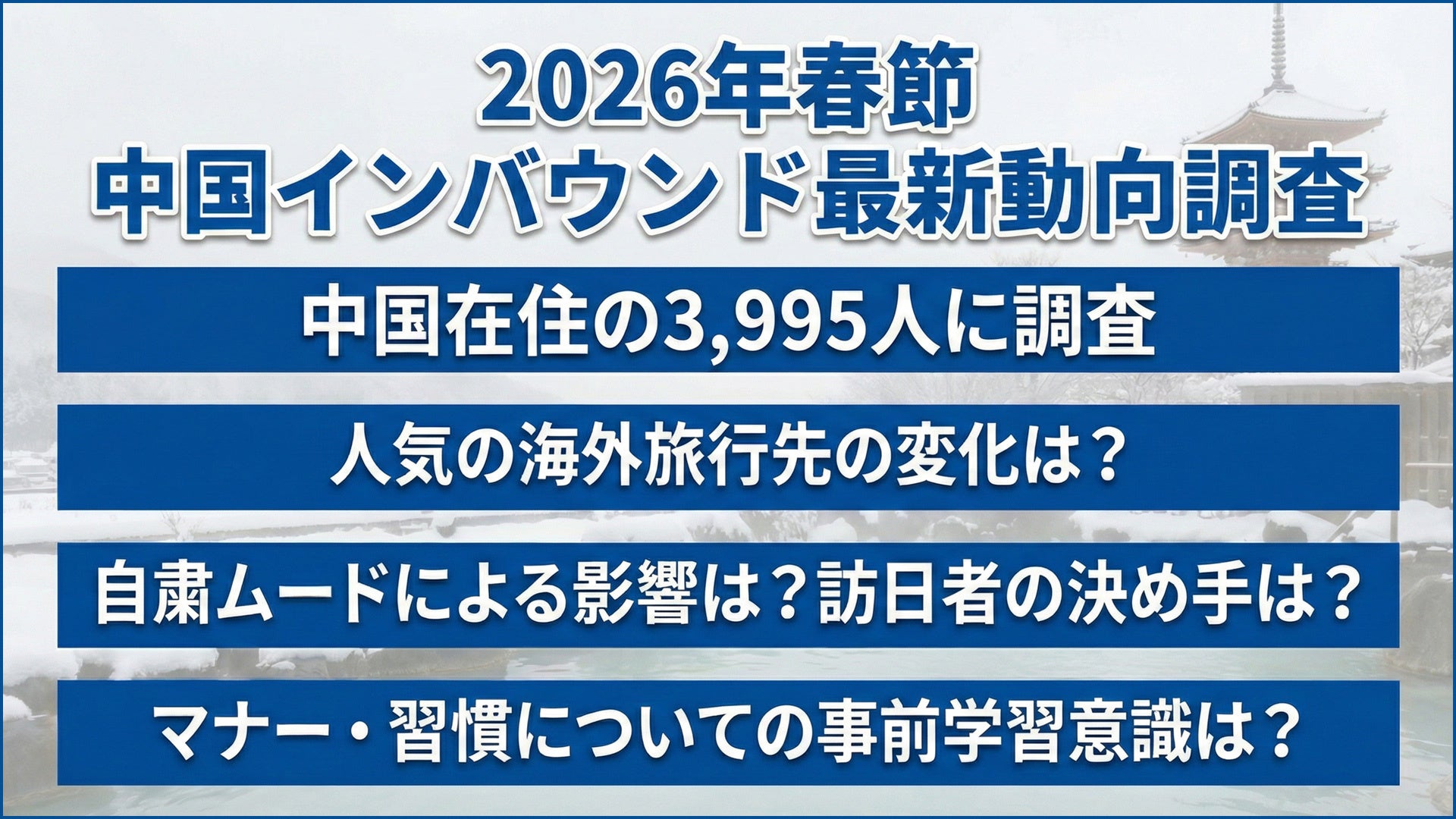本調査は、テンセント社が提供するメッセンジャーアプリ「WeChat」上のアンケート機能を使用し、中国在住の方(有効サンプル数:3,995人、そのうち2026年の春節期間中に海外旅行をすると回答した2,869人、その中で「日本」を訪問予定と回答したのは429人)を対象に、2026年1月15日~17日に実施しました。