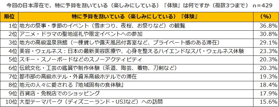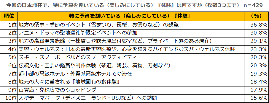 ■「今回の日本滞在で、特に予算を割いている(楽しみにしている)『体験』は何ですか(複数3つまで)」(回答数:429人、複数回答)