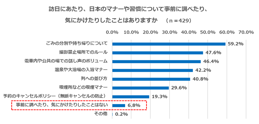 ■「訪日にあたり、日本のマナーや習慣について事前に調べたり、気にかけたりしたことはありますか」(回答数:429人、複数回答)