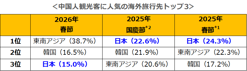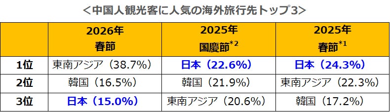当社が昨年実施した、2025年の春節期間および国慶節期間の日本旅行に関する調査*1、*2と比較すると、「東南アジア」の人気が大幅に上がる一方、「日本」は昨年の春節期間と比べて9.3ポイント下がる結果となりました。