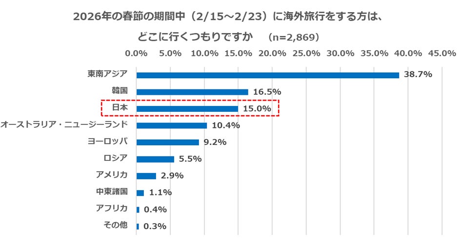 2026年の春節期間、中国人観光客に人気の海外旅行先1位は「東南アジア」、2位が「韓国」、3位が「日本」に