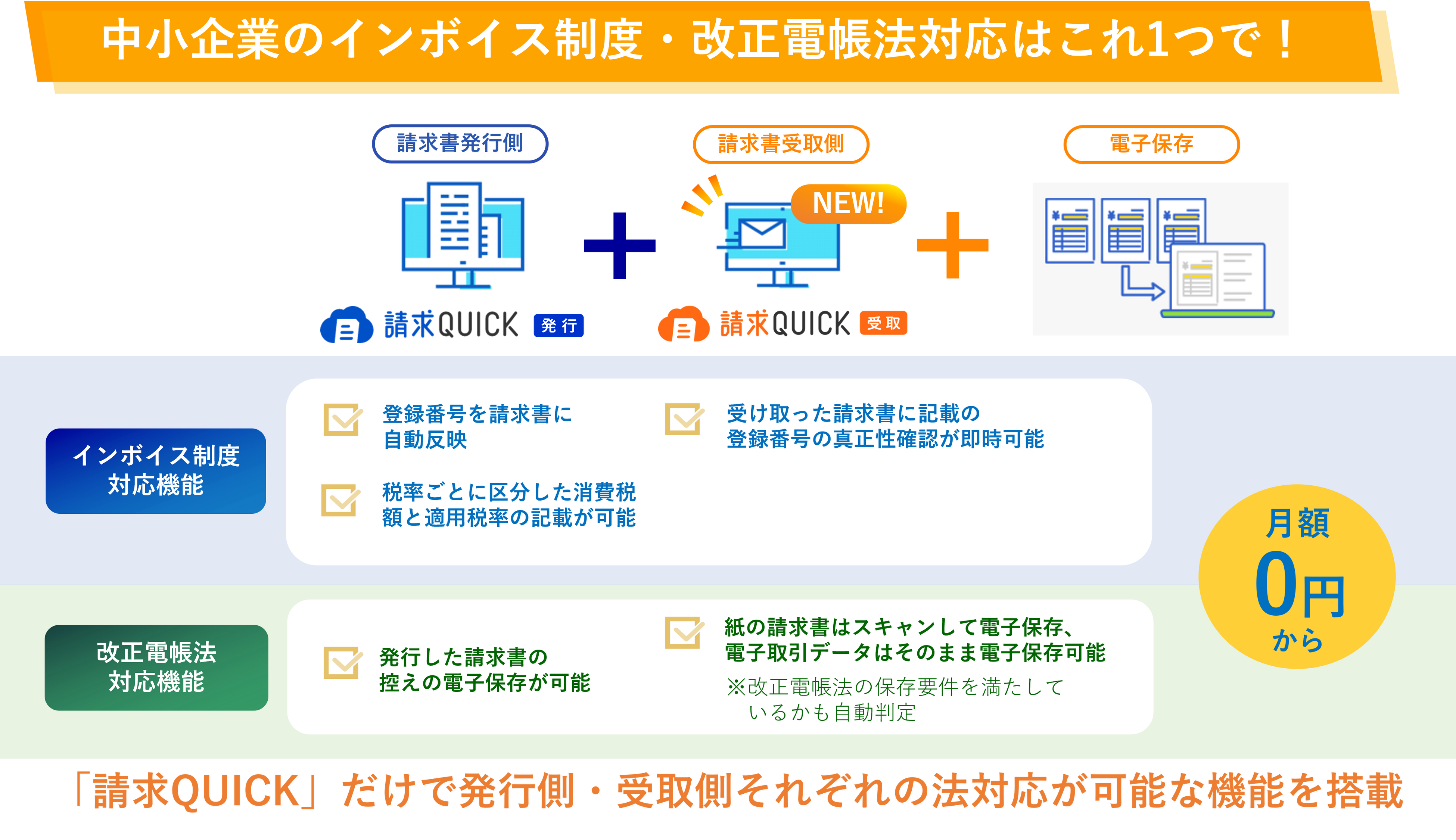 間近に迫るインボイス制度開始や改正電帳法の宥恕期間終了は、事業者にとって請求書関連業務の負担がさらに増えることが懸念されています。こうした課題に対し、当社は月額無料から使える「請求QUICK」の料金体系を維持しつつ、請求書の受取機能を本日9月14日(木)に実装いたしました。これにより、インボイス制度対応のための3つの機能である「請求書発行・請求書受取・電子保存」を1つのシステムでシームレスにご利用可能ですので、システムの専門家がいない中小企業においても、経理担当者だけでデジタルツールによる効率的なインボイス制度・改正電帳法対応が行えます。