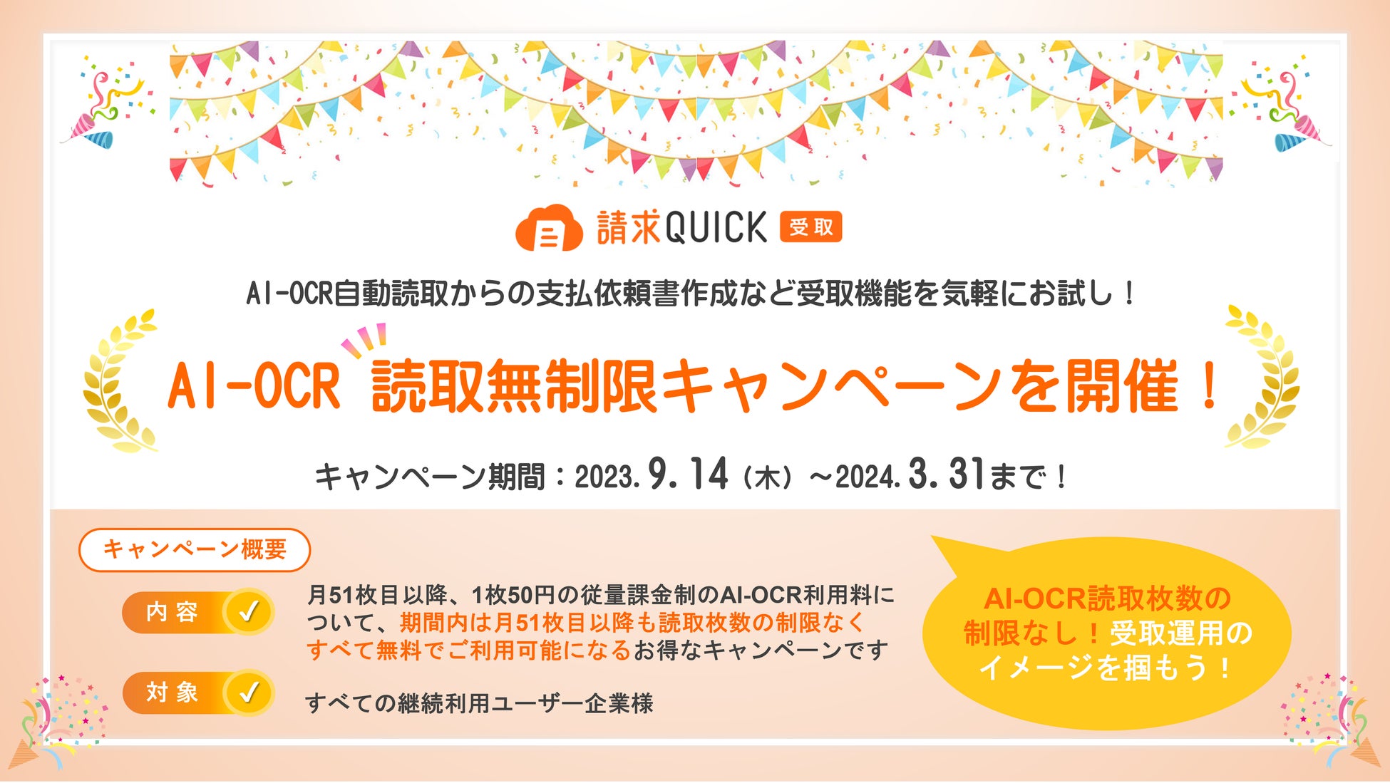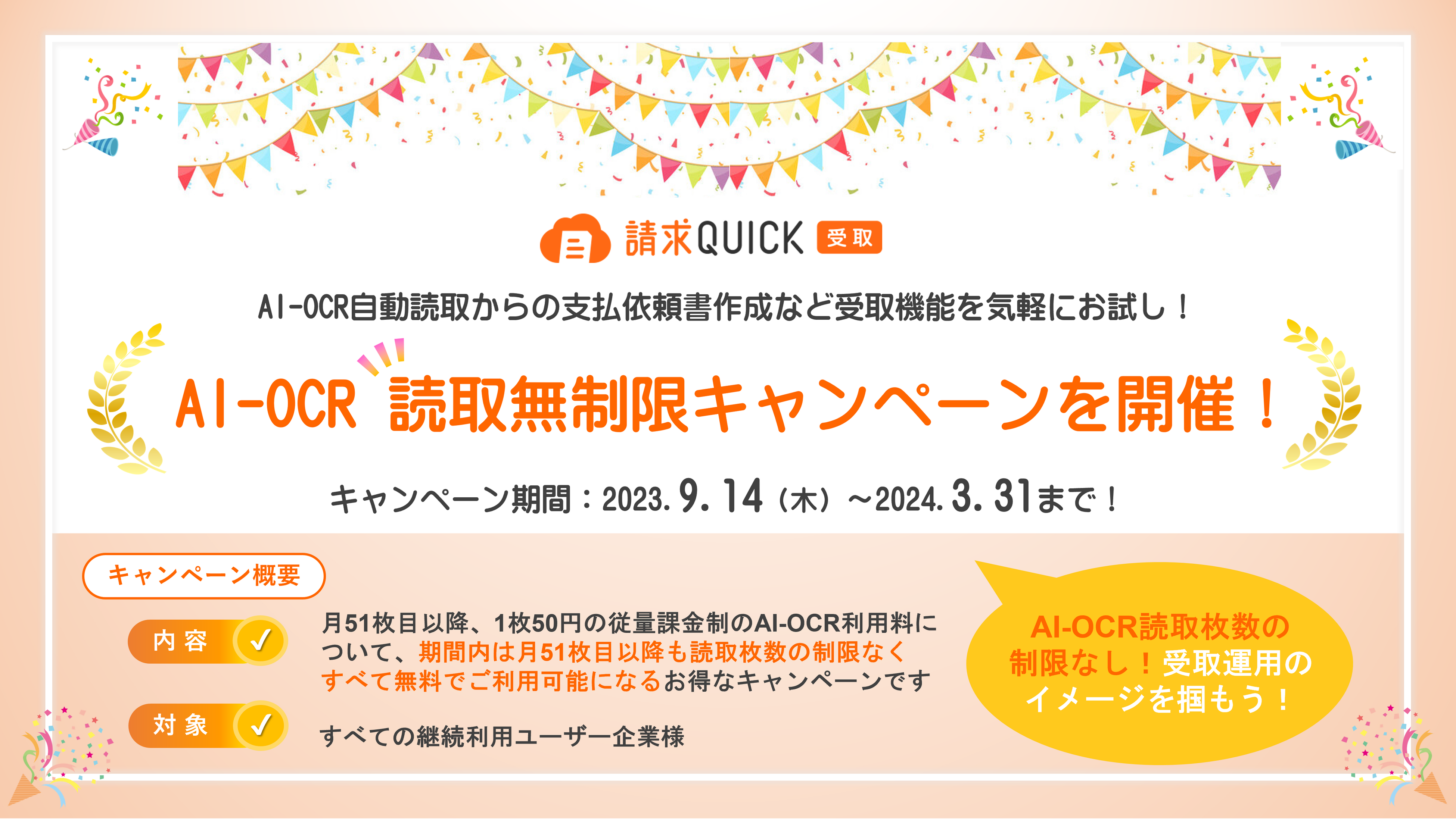 本日より2024年3月31日(日)までを対象期間として、受取機能の従量課金部分である月51枚目以降1枚50円のAI-OCR利用料を、読取枚数の制限なくすべて無料でご利用できるお得なキャンペーンです。ぜひこの機会に、AI-OCRを使った自動読取からの支払依頼書作成を含め「請求QUICK」の受取機能をご利用ください。