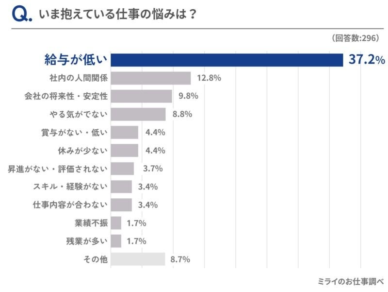 社会人経験のある男女296名に「いま抱えている仕事の悩み」について聞いてみると、37.2%の人が「給与が低い」と回答。2位の「社内の人間関係」に24.4ポイントの差をつけてダントツの1位となりました。