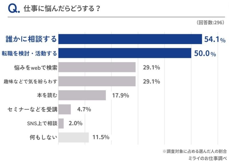- 仕事に悩んだ時の解決法は「誰かに相談する」が54.1%