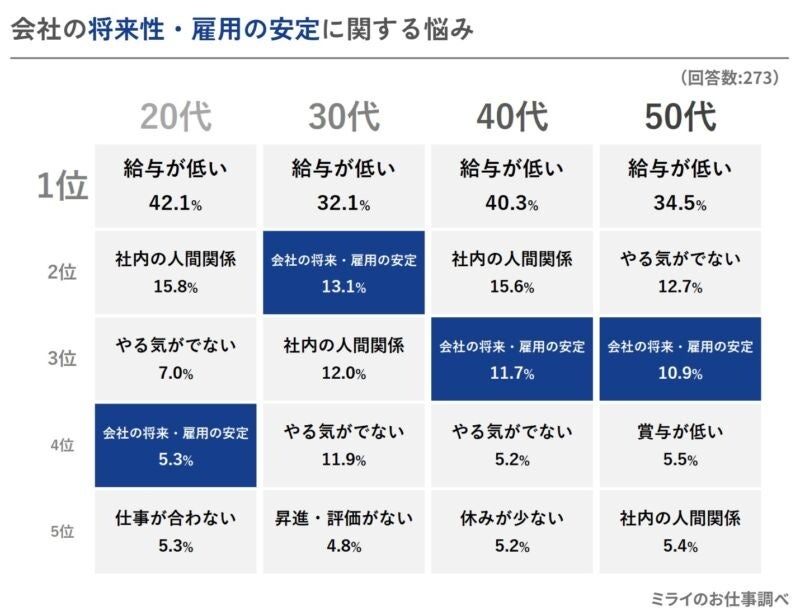 - 3位の「会社の将来性・雇用の安定性」への不安は、30~50代で10%超え