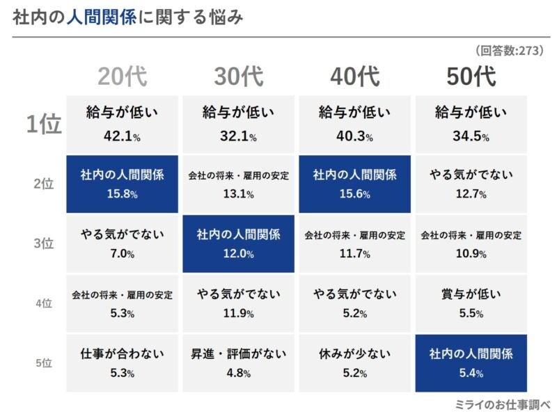 「給与の低さ」に次いで各世代で上位に入っているのは、総合順位でも2位の「社内の人間関係」の悩みでした。とくに20~40代の若い世代で上位になっています。