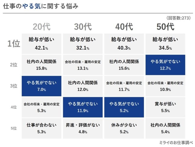 - 4位の「仕事へのやる気が出ない」も各世代でTOP5入り