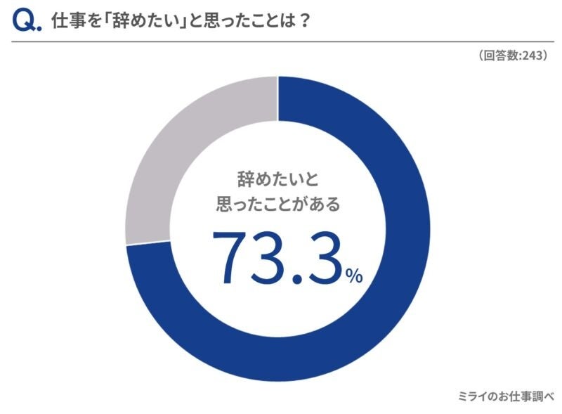 さまざまな悩みや不満がある中で、73.3%の人がこれまでに仕事を辞めたいと思ったことが「ある」と回答しました。