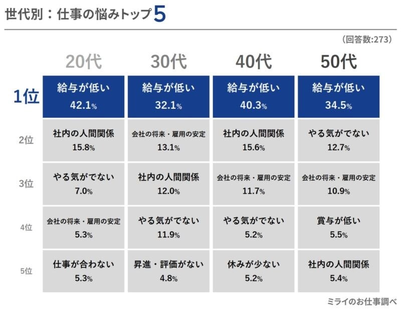 - 1位の「給与が低い」は、20~50代の全世代で共通の悩み