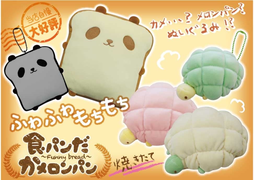 マリン・アニマルグッズの企画、開発、販売やスーベニアグッズのOEMを手がけています。新登場の「かメロンパン」、「食パンだ」はパンとコラボの癒やされるぬいぐるみです。