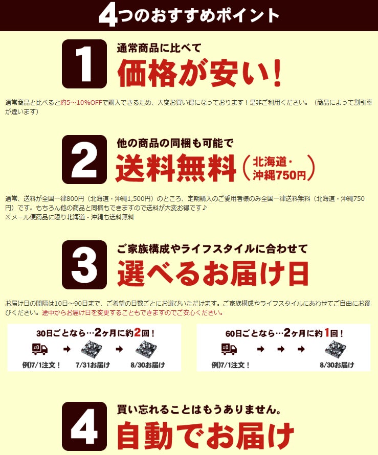 定期購入サービスの商品は、通常商品と比べて5~10%OFFというお得な価格で提供しております。また、定期購入商品と一緒に他の商品を同梱できるほか、送料が全国一律無料(北海道・沖縄は750円)という特典もございます。定期的な注文を忘れる心配もなく、お客様のライフスタイルに合わせた柔軟なサービスが可能です。