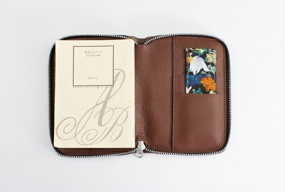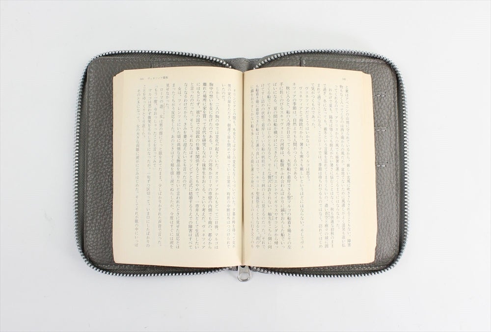 1925年創業の東京・浅草の老舗皮革メーカー「三竹産業」に制作を依頼したブックカバー。 エンボス加工のしぼ感と柔らかさが特徴的なイタリアンレザーを使用したポーチタイプのブックカバーです。 サイズは文庫本(ハヤカワ文庫も入ります)仕様で、本好きな方への贈り物としてもおススメです。