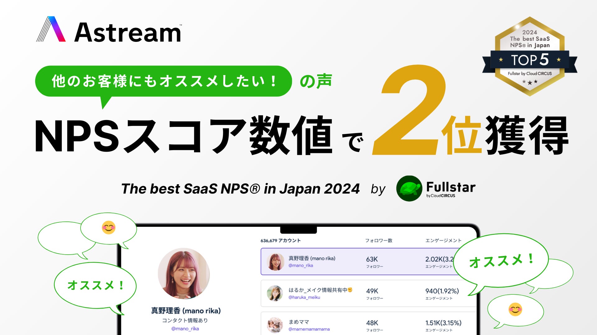 株式会社A(読み:エース、代表取締役CEO 中嶋泰、以下「当社」)は、当社が提供するインフルエンサーマーケティングツール「Astream」が、クラウドサーカス株式会社が発表した「The best SaaS NPS® in Japan 2024」ランキングにおいて、第2位に選出されたことをお知らせいたします。