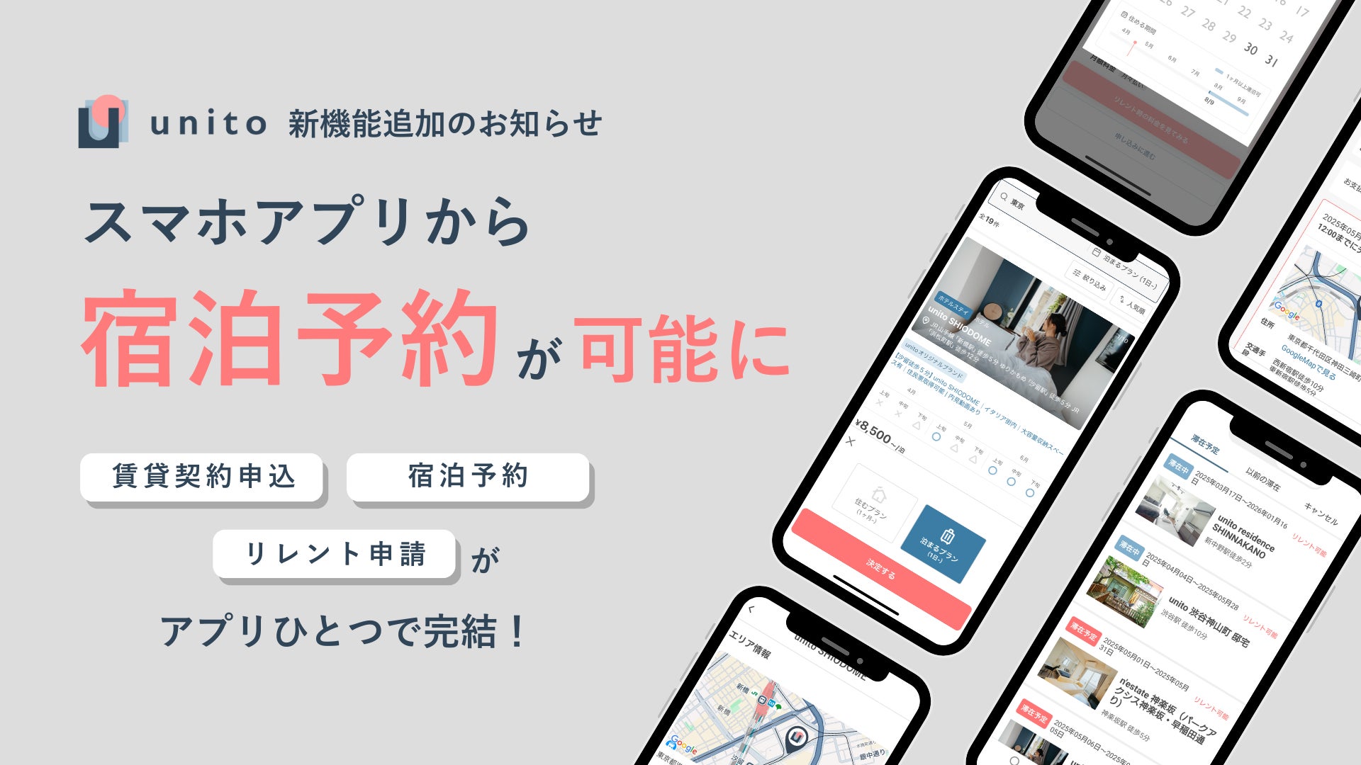 最短即日入居できるお部屋探しプラットフォーム「unito(ユニット)」、スマホアプリに宿泊予約機能を追加