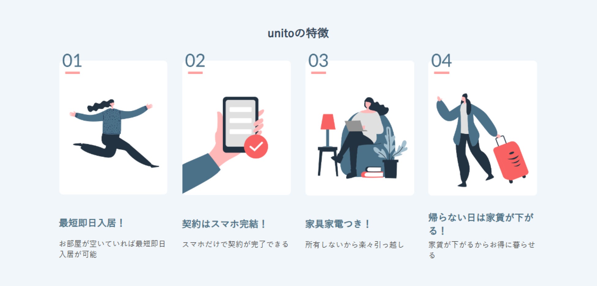「unito」は、オンラインで契約を完結でき、最短即日で入居可能な部屋探しができるプラットフォームです。掲載されている部屋には、通常の賃貸で必要な家具・家電に加え、Wi-Fiや生活必需品も完備されており、スーツケース1つで手軽に引っ越しできます。