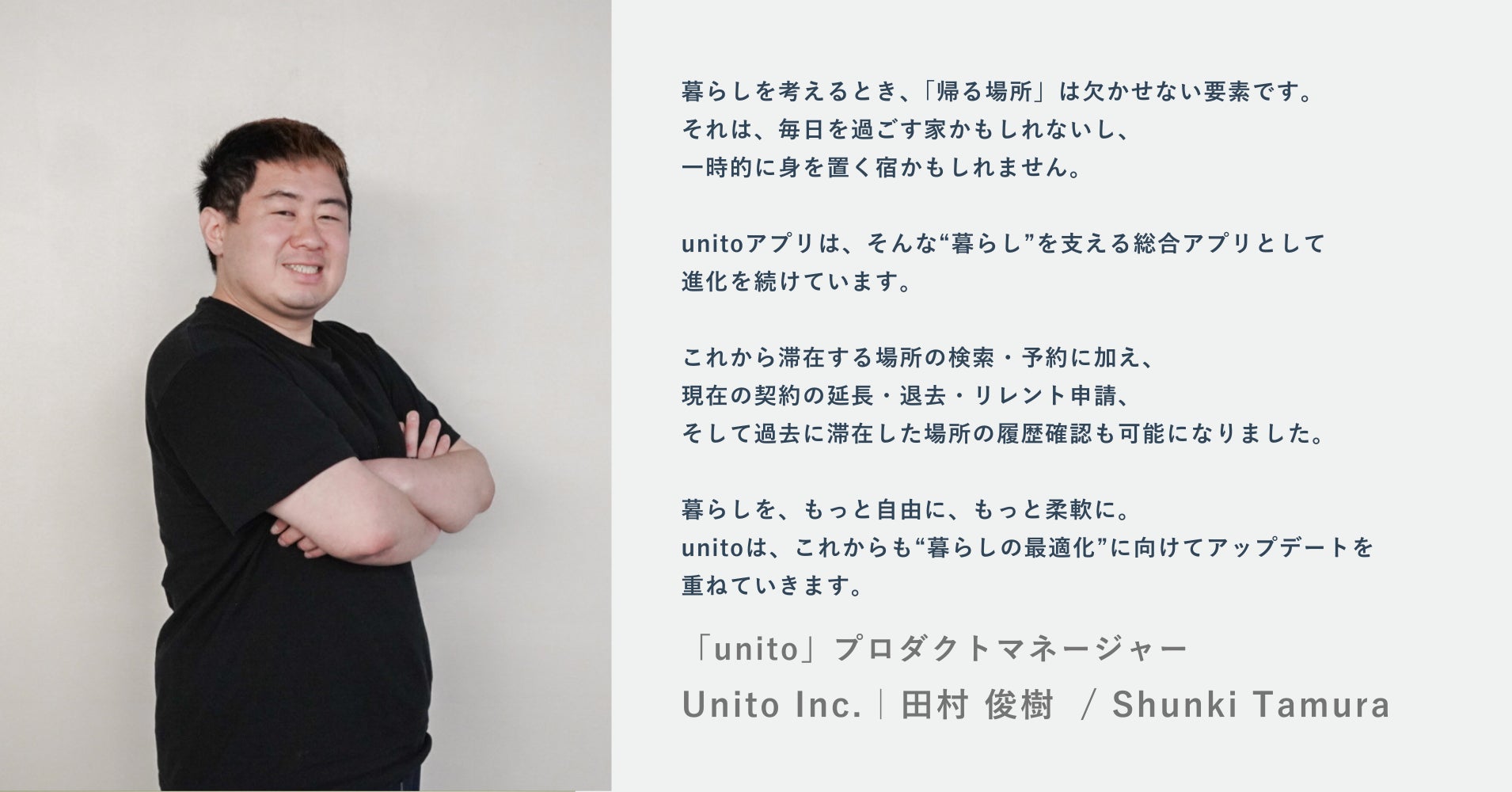 今後もテクノロジーの力で、「住むと泊まる」を融合させたハイブリットアセット「unito」の利便性をさらに向上させ、暮らしを柔軟に変えていくプロダクト開発に取り組んでまいります。