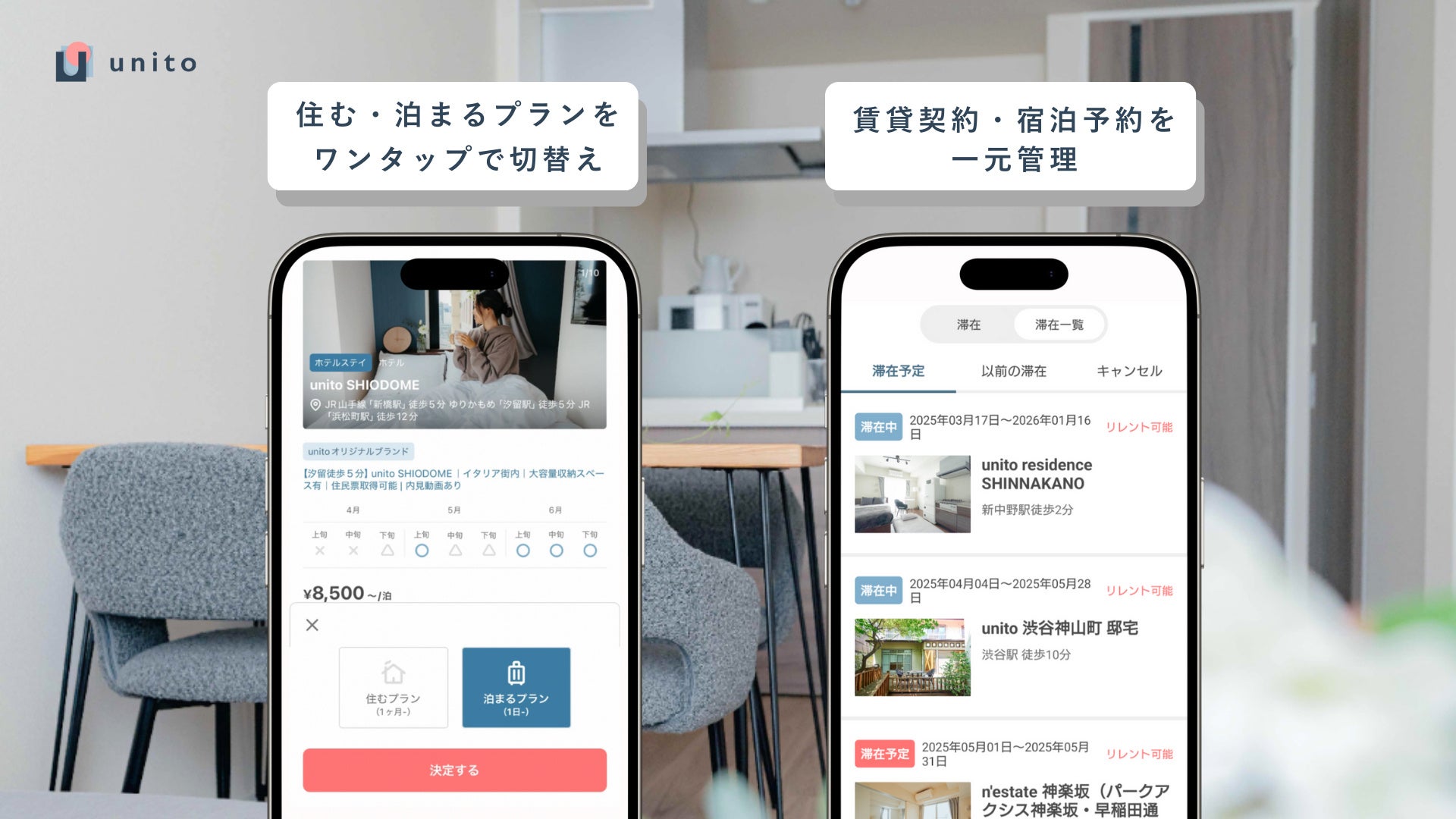 宿泊予約機能の利便性を高めるため、「住むプラン(賃貸契約)」と、「泊まるプラン(宿泊予約)」をワンタップで切り替えできる機能を追加。unitoに掲載されている家具・家電付きホテル・サービスアパートメント2,330室(2025年5月現在)の契約申込・宿泊予約が可能になりました。