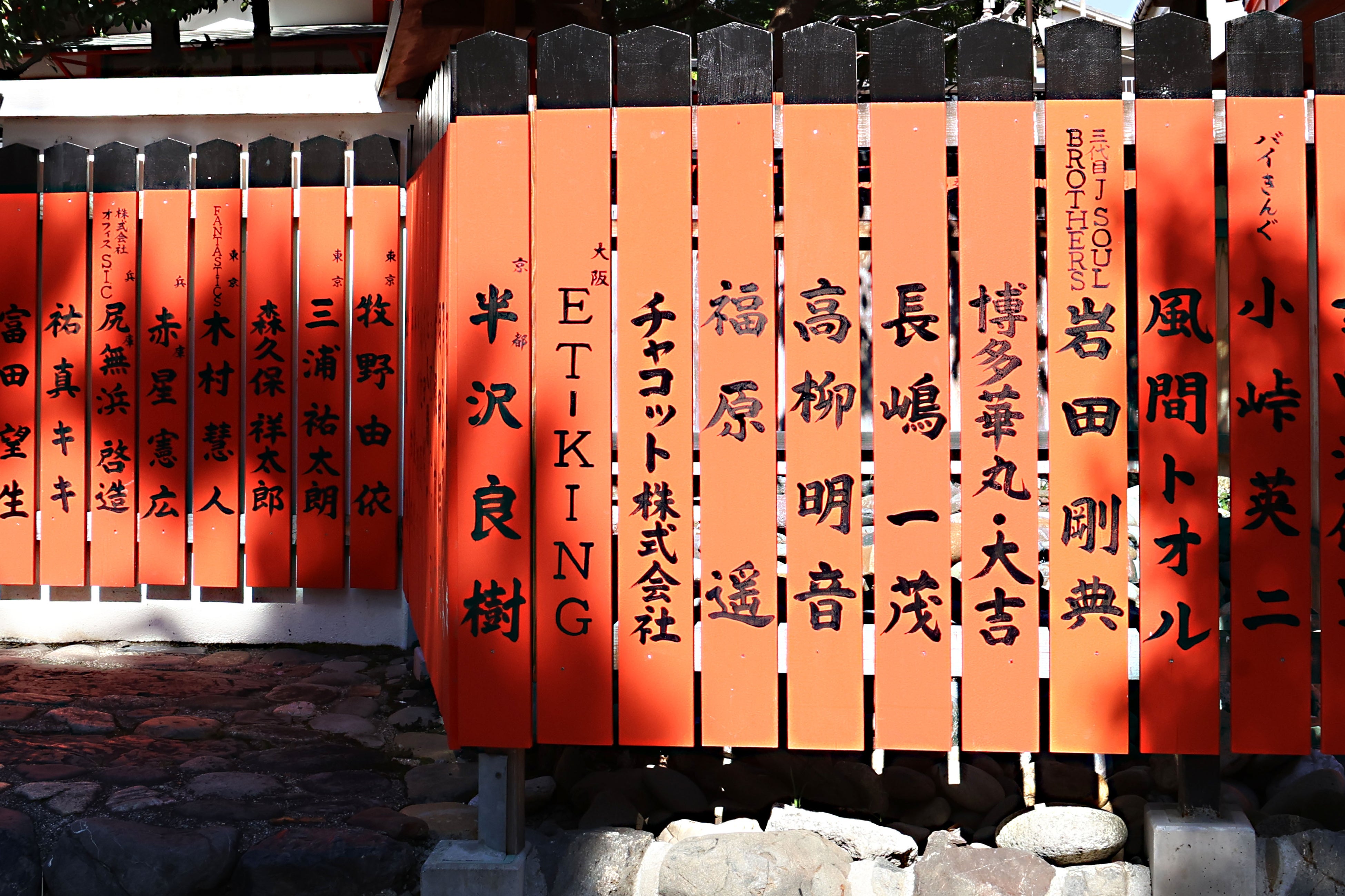 車折神社は京都嵐山に鎮座し、願い事を叶える「祈念神石」が古来より信仰されています。また、境内(敷地内)には、芸能・芸術の祖神である天宇受売命を祀る「芸能神社」があり、あらゆる芸能・芸術のジャンルで活躍する方々の芸名や団体名を記した「朱塗りの玉垣」が奉納されています。