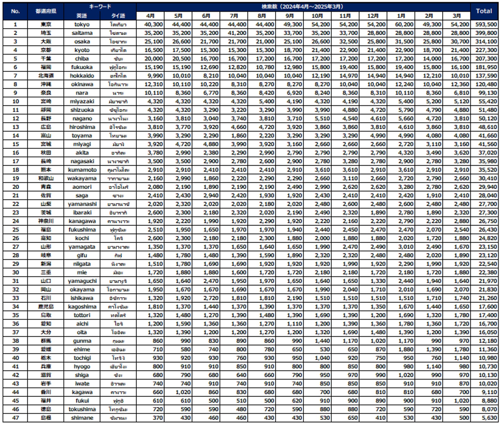 以下の表は、2024年4月~2025年3月のタイにおける「日本の都道府県」の検索数をまとめたものです(英語およびタイ語での検索数の合計)。検索数の上位を占めた1位東京、3位大阪、4位京都の大都市圏および、6位福岡、7位北海道、8位沖縄については、これまでアウンコンサルティングが発表した米国編、香港編の調査と同様の傾向であると考えられます。