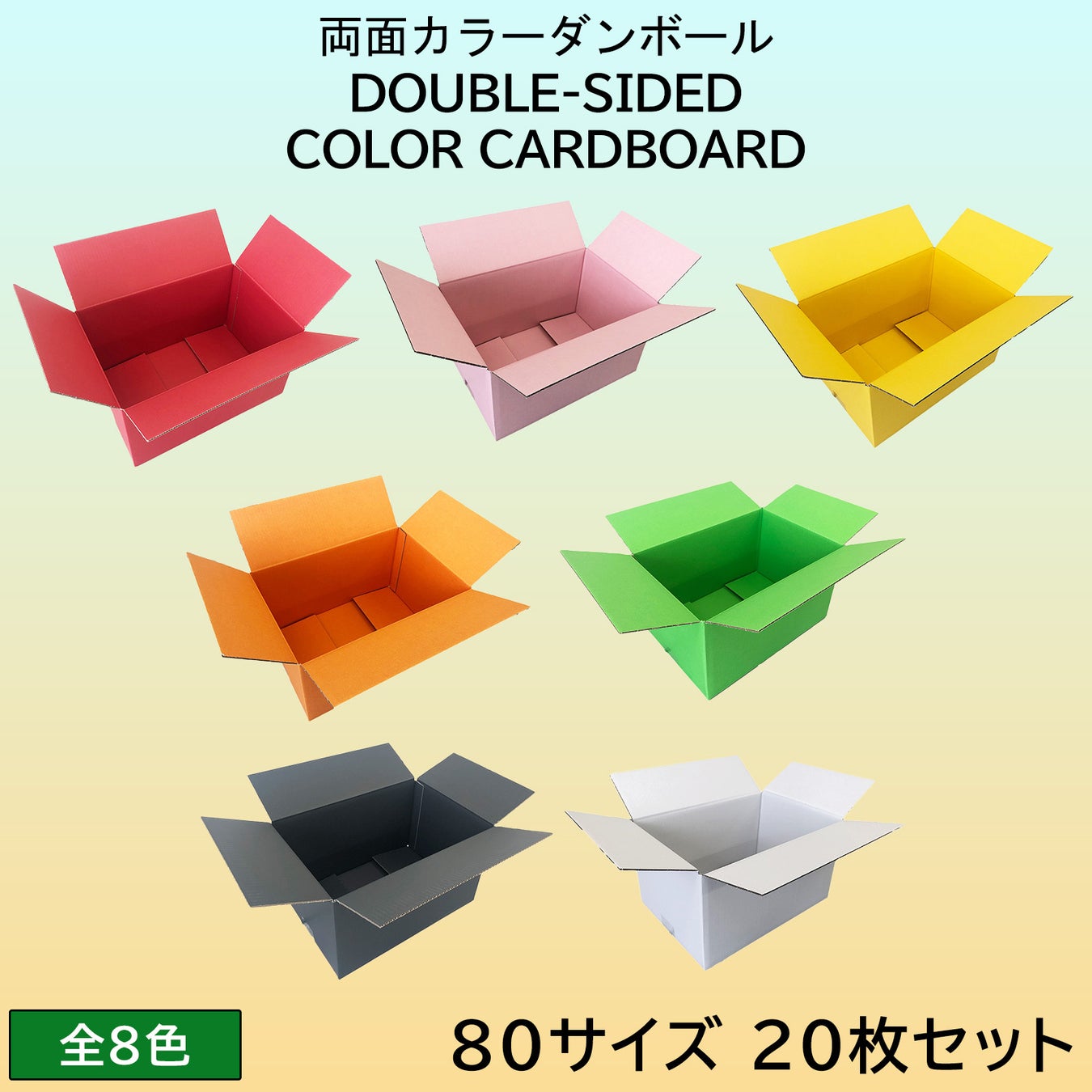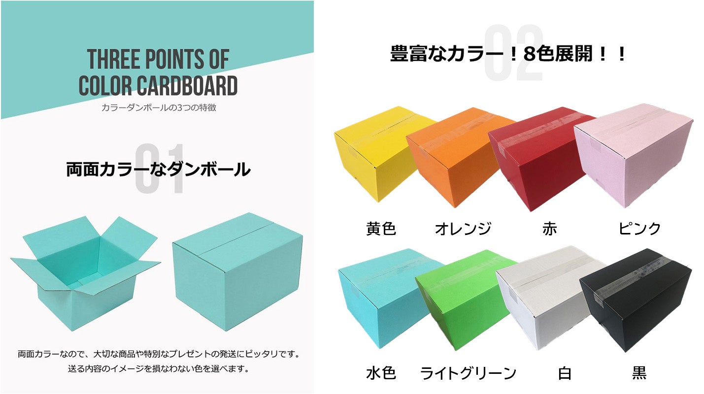 80サイズのカラーダンボールは「赤・ピンク・黄・オレンジ・緑・水色・黒・白」の合計8色で展開。