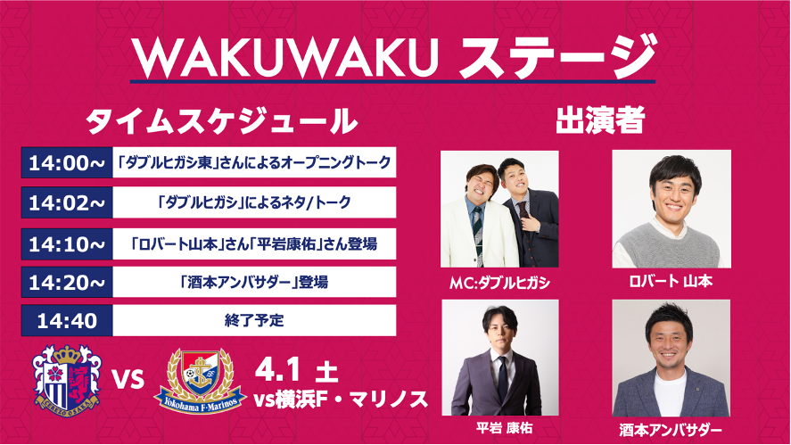 【セレッソ大阪】4/1(土)横浜FM戦のWAKUWAKUステージに「ロバート 山本」、ytv漫才新人賞獲得の「ダブルヒガシ」がコンビで登場!