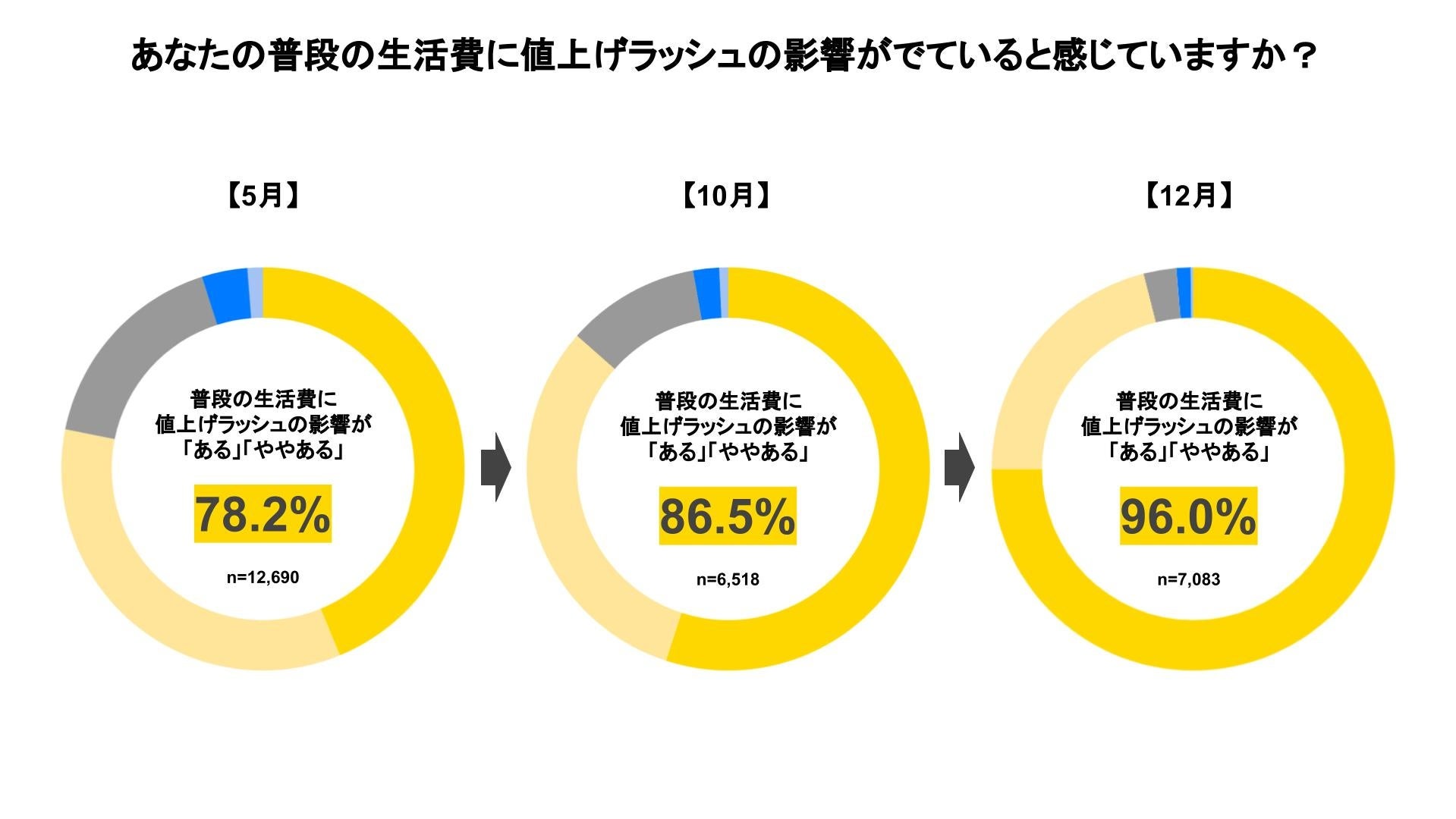 12月の調査結果では、普段の生活費に値上げラッシュの影響が出ていると感じている人は96.0%おり、2022年5月調査の回答(78.2%)、2022年10月調査の回答(86.5%)と比較して、大きく増加。ほぼ全ての方に値上げの影響が行き渡っていることが確認されました。