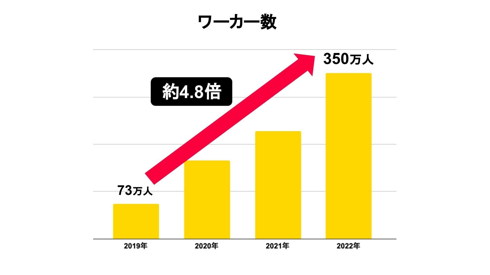 タイミーは、2018年8月にサービスを開始以降、順調にワーカー数を伸ばし、2022年11月には350万人を突破しました。2019年と比較すると約4.8倍となりました。