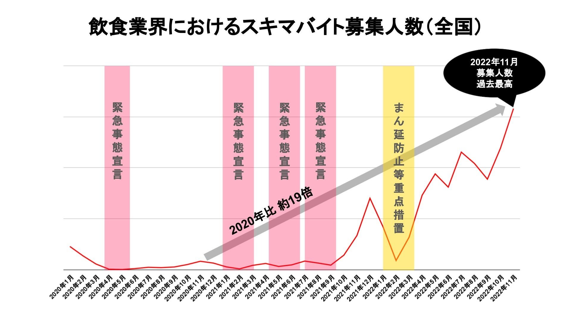 コロナ禍における緊急事態宣言やまん延防止等重点措置の影響により、一時落ち込んだ飲食店の募集人数は、2021年後半にかけて徐々に回復。2022年11月には過去最高の募集人数となり、2020年11月と比較すると約19倍に増加しました。