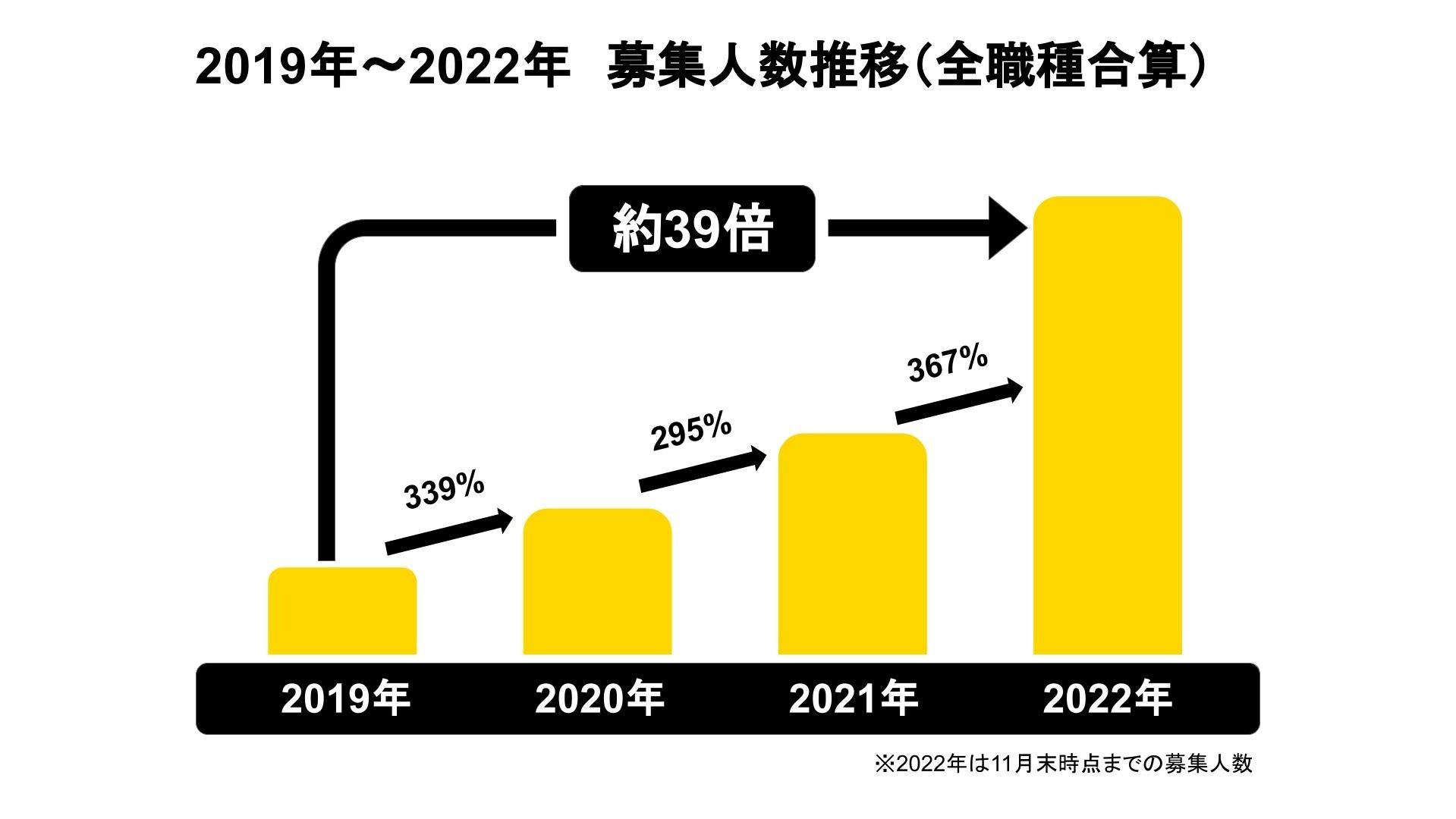 事業者数・事業所数の拡大にともない、募集人数も急増しており、2019年と比較すると2022年11月末までのタイミー上の募集人数は約39倍となりました。