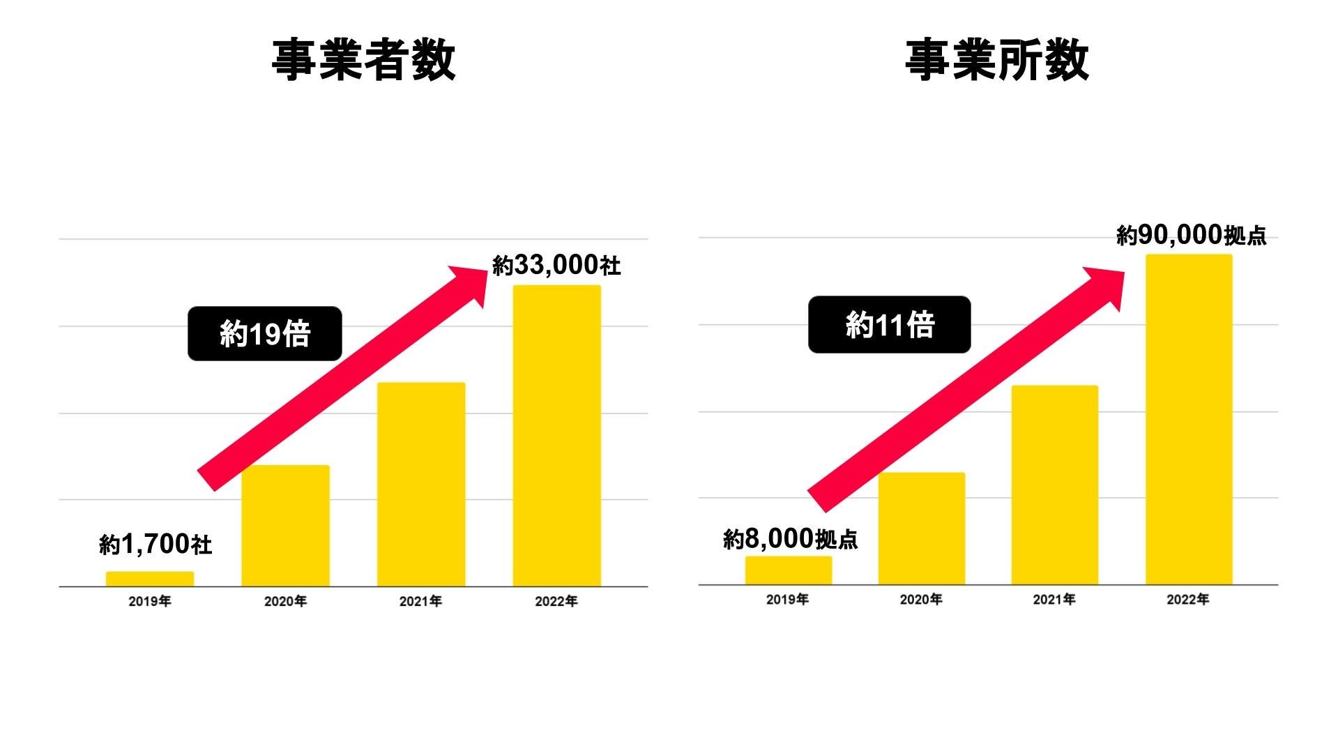 ワーカー数だけでなく、事業者・事業所数ともに急激に拡大をしています。現在、約33,000事業者、約90,000拠点でタイミーを活用いただいています。2019年と比較すると事業者数は約19倍、事業所数は約11倍となりました。
