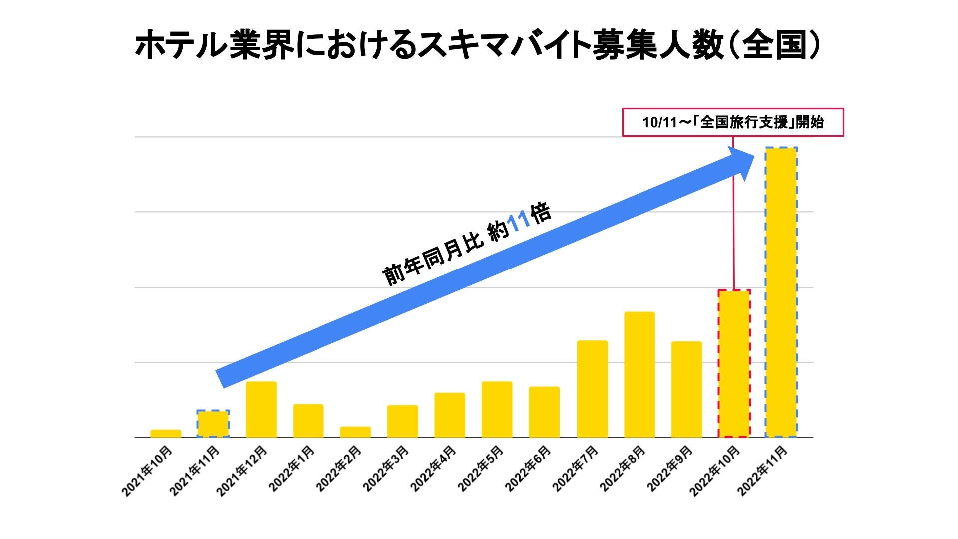 ・ホテル案件の募集人数が過去最高に。2022年11月の募集人数は前年同月比で約11倍に増加。