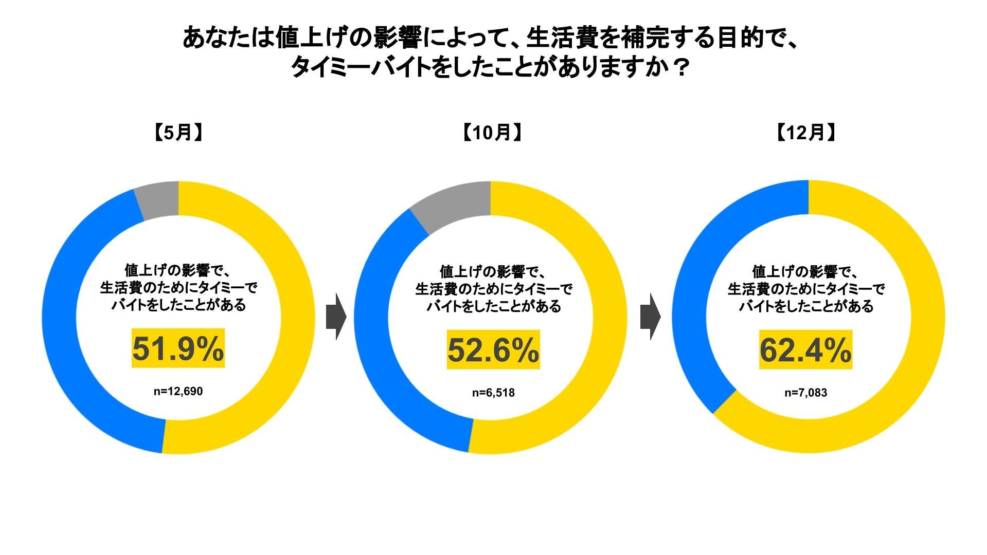 そんな中、62.4%もの人が値上げの影響で生活費を補完する目的で「タイミー」のスキマバイトをしたことがあると回答。2022年5月調査の回答(51.9%)、2022年10月調査の回答(52.6%)と比較して、増加幅が拡大していることがわかり、相次ぐ値上げによる物価高の影響を、スキマバイトの収入で補っているという実態が判明しました。